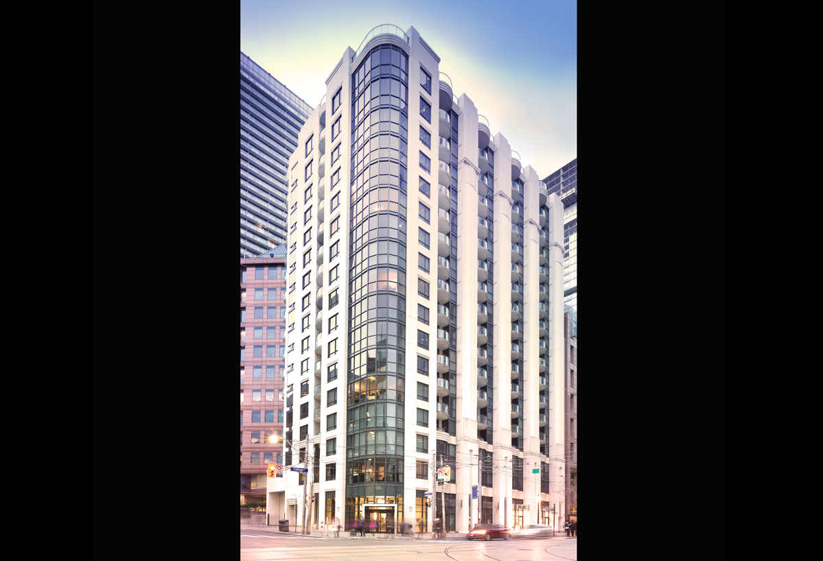 This condominium on the north east corner of College and Bay Sts. takes its cue from one of the city’s favourite Art Moderne structures – the former Eaton’s College St. building across the street. Light in colour with the rounded corners and a streamlined verticality, The Royalton echoes the style of its high-profile neighbour. Architect Attila Burka called this project, (located on an “impossible 100-foot by 100-foot site” between a government building), his “Swiss watch” for its complex interlocking plan incorporating 137 suites. This trendsetting project helped pioneer the movement towards the replacement of C-class office buildings with residential condominiums, and introduced residential uses to Bay St. near the business district. The Royalton features an extraordinary roof-top garden and party area, guest suites, and full catering kitchen.